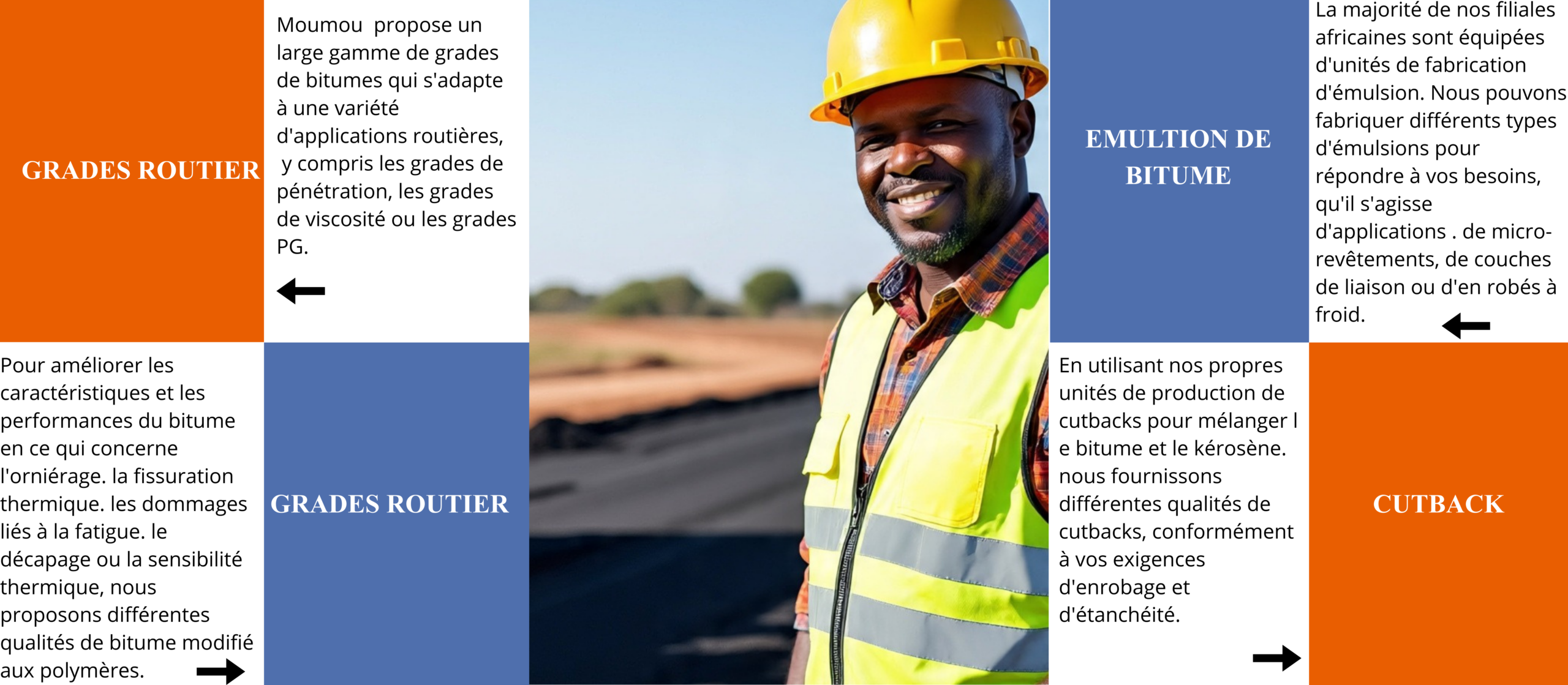 Grace a notre chaine d’approvisionnement éprouver et a notre logistique développé, nous sommes en mesure de fournir une grande variété de produits bitumineux, de qualité standard a supérieure, ainsi que les liants spéciaux , pour toutes les application routières. Moumou MS Asphalte vous fournir le bon produit, aux bonne spécification et au bon moment